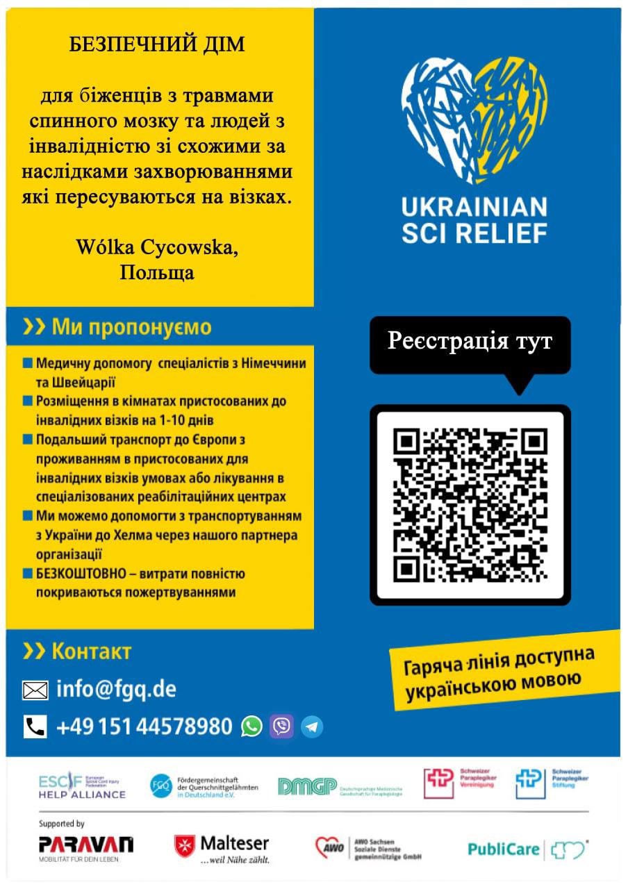 Since the beginning of April in the frames of pan-european cooperation with noncommercial associations we have organized “Safe House” for refugees from Ukraine with spinal cord traumas and disabled using wheelchairs. To provide certain life standards and good medical check we cooperate with more than 30 specialized clinics which are related to patients having vertebra traumas and we also let such patients live longer in Germany, Switzerland and Denmark and other countries. The whole project will be funded by us and will be calculated as minimum for six months.